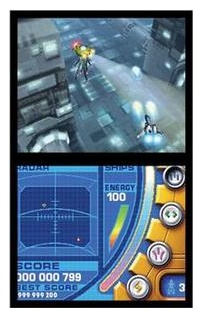 Apart from the touch-screen activated weapons, your ship also carries a powerful beam weapon, which can be charged by collecting blue coins, and several screen-clearing smart bombs (the exact number depends on the difficulty level chosen). With all these powerful weapons, you might start to feel invincible. However, your ship is only very lightly armoured and can only withstand a limited number of hits from enemy flak and will be destroyed instantly should you be unfortunate enough to collide with an enemy. The graphics in Nanostray are of a high standard, though only one screen is ever used for the action. The enemy ships look great and the game uses the DS's 3D abilities to render some great looking hunks of space metal. Sound effects are also strong and the game benefits from being played with headphones, thanks to a catchy soundtrack. Each stage is only a few minutes long but does not feel overly short (you're kept perfectly busy during that time) and ends with the obligatory boss battle. Here you have to fight a particularly tough and well armed enemy. Most players will save their smart-bombs for this encounter. Because smart-bombs reload after a life is lost, the bosses can be dealt with easily by releasing several of these powerful weapons. However, more experienced shoot-em-up players will relish the challenge of fighting the bosses without bombing them into oblivion.